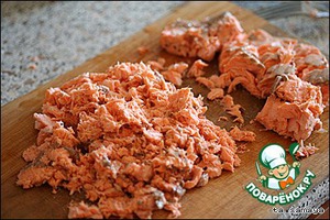После того, как рыба отварилась, отделяем ее от кожи и большую ее часть давим вилкой. Остальное режем на небольшие кусочки. Эта часть пойдет для украшения супа.