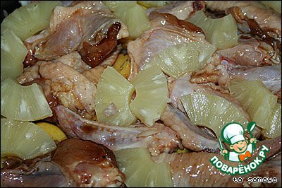 Раскладываем сверху крылья и нарезанные на кусочки кольца ананаса.