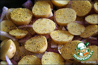Сверху раскладываем еще кружочки картофеля и посыпаем специями.