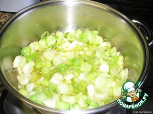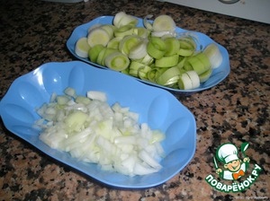 Порезать лук репчатый кубиками и лук порей кружочками.