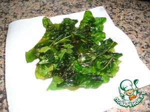 Тем временем жарим отложенные листья шпината на подсолнечном масле с двух сторон. Выложить на бумажную салфетку.