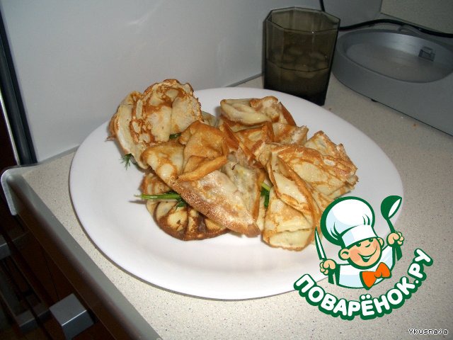 Только там блины были завёрнуты без использования зелени - в форме конвертика (если я правильно выражаюсь). Обязательно попробую сам приготовить.