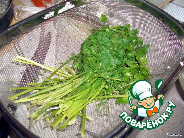 Моем зелень, обдаем её кипятком, чтобы она стала мягкой, т. к. нам надо будет её использовать вместо веревочки.