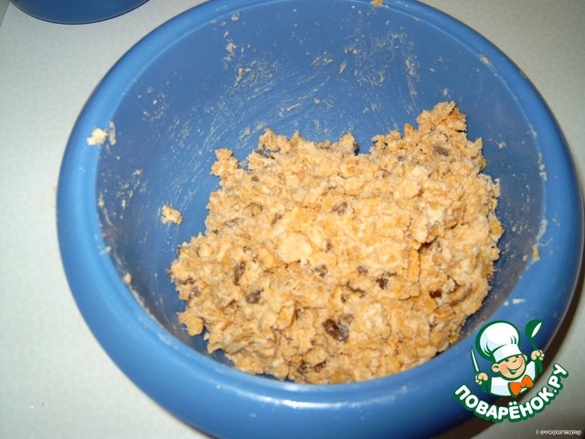 • Добавить изюм и кукурузные хлопья (предварительно размять немного руками), перемешать всё руками, смесь получается очень рассыпчатой.