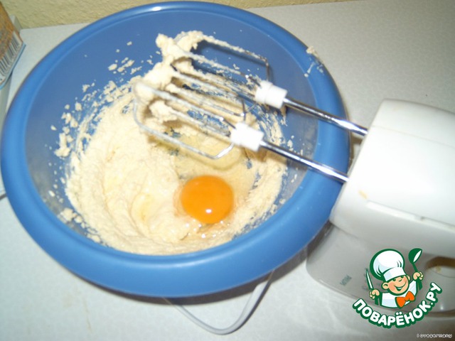 • Маргарин с сахаром взбить, добавить яйцо и ещё раз тщательно перемешать миксером.