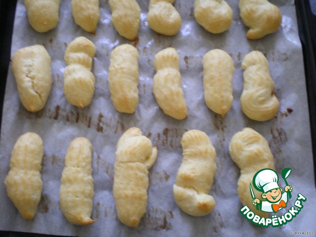 Приготовленное тесто распределить(я это делаю кулинарным шприцем) на слегка смазанный маслом и посыпанный мукой противень(я постелила бумагу для выпечки и слегка смазала её).