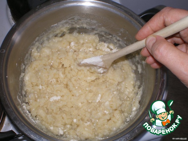 Всыпать просеянную муку.Варить на слабом огне,постоянно помешивая,до образования однородной массы.