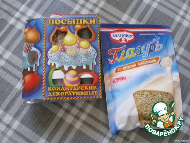 Далее я беру вот такую глазурь со вкусом марципана(можно сделать самостоятельно как для куличей)и кондитерские посыпки.