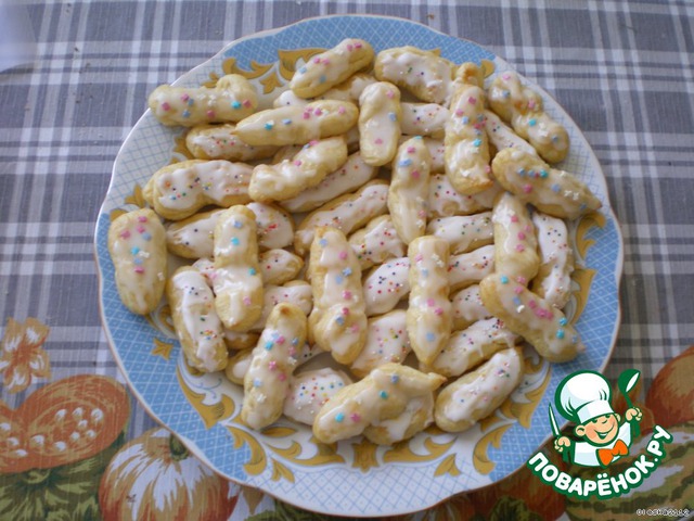 Глазурь разводим водичкой по инструкции и быстренько(чтобы не застыла)наносим на печенюшки,сверху посыпаем конфетти кондитерским.Вот так у нас получилось.