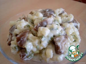 C грибов слить маринад, порезать (не очень мелко), картофель порезать кубиками, мелко порезать лук. Заправить майонезом. Посолить и поперчить по вкусу. Приятного аппетита!