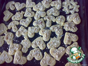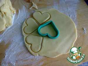 Спустя 30 мин. тесто раскатать в пласт толщиной 0,8 см. И вырезать формой печенье. У меня были формочки сердечко и птички.