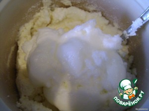 Смешиваем творог и сахар 1 ст. до однородного состояния, добавляем белки и перемешиваем. -