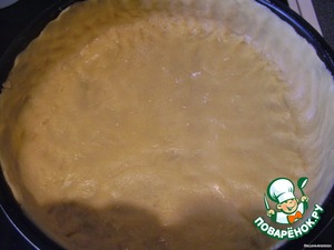 В смазанную форму выложить половину теста, распределив по дну и по краям руками
