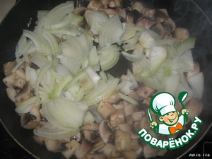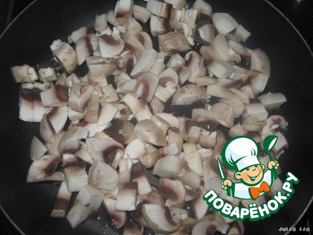 • Для начинки обжарить в течение 2-х минут на небольшом количестве растительного масла нарезанные (не мелко) шампиньоны.