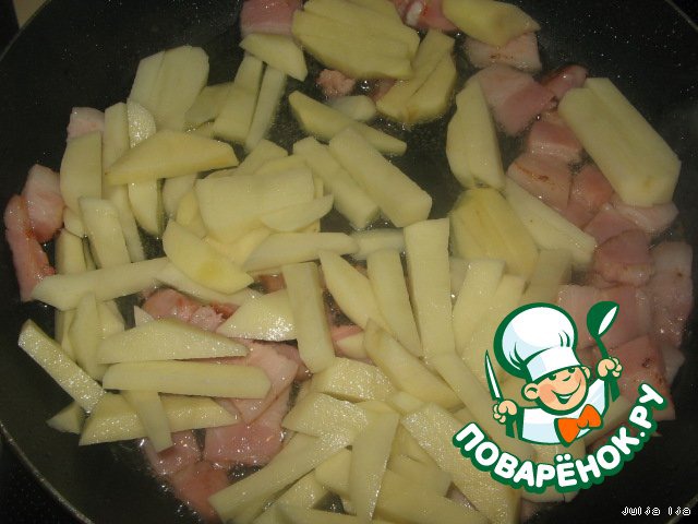 • Добавить картофель, нарезанный соломкой. Обжарить до корочки.
