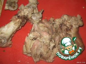 • Рульку вынуть из бульона, немного остудить, разрезать и вынуть кость.