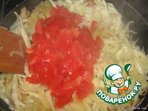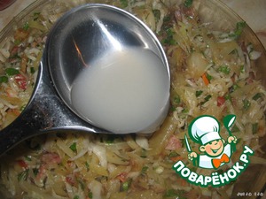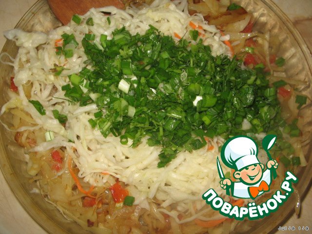 • Выложить капусту в огнеупорную форму или в глубокий противень. Добавить квашеную капусту и мелко нарезанную зелень.