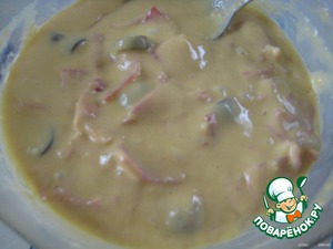 В тесто добавить ветчину и оливки, нарезанные кусочками.