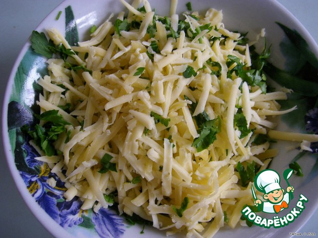 Твердый сыр натереть на крупной терке, добавить мелко рубленную зелень петрушки и укропа. Перемешать.