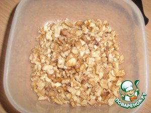 Орехи поломать или порезать не очень мелко - примерно на четвертинки.С изюма слить воду.