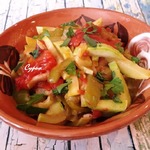 Помидоры очищаете от шкурки, режете на мелкие кусочки и бросаете в готовящиеся овощи, добавляете специи по вкусу и сметану.