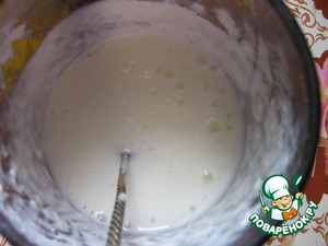 В кефир засыпаем на кончике ножа соду и отставляем в сторону чтобы запузырилось и немного подошло.