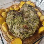 Мясо в маринаде выкладываем на противень, закладываем в каждый надрез перо зеленого чеснока и выливаем оставшийся маринад. На противень выливаем 100 мл белого вина, накрываем сверху фольгой, и ставим в духовку запекаться.