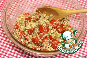 Соединить черри, базилик с чесноком, миндальную крошку, пармезан. Добавить оливковое масло и перемешать, слегка придавливая помидоры.