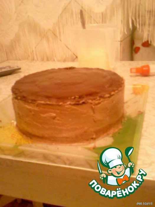 Готовим масляный крем: смешиваем масло со сгущённым молоком. В третью часть этого крема добавляем ванильный сахар, а в 2/3 - какао - вымешиваем две части нашего масляного крема. Шоколадной частью крема смазываем для выравнивания бока нашего торта. -