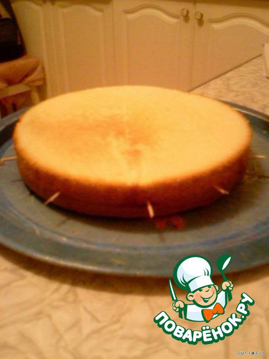 Каждый из бисквитов нам нужно равномерно разрезать пополам. Для этого я посредине каждого бисквита разместила половинки зубочисток. -