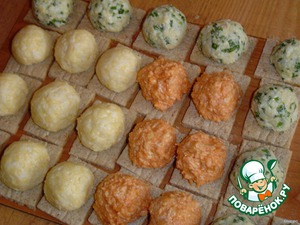Из сырной массы формируем шарики и укладываем их на хлебцы.