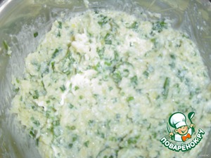 Во вторую часть добавляем мелко нарезанную зелень,а также щавель и шпинат.Заправляем все это сметаной.