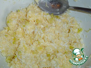 Получившуюся массу разделяем на три части.В первую - добавляем майонез,перемешиваем.