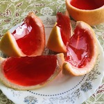 Когда желе остынет, аккуратно разрезаем каждую половинку пополам. Получается кусочек фрукта, где вместо обычной мякоти нежное фруктовое желе.