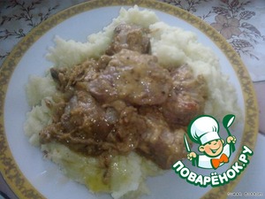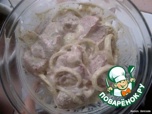 Мясо нарезать не большими кусочками. Замариновать в уксусе, масле и майонезе со специями)))