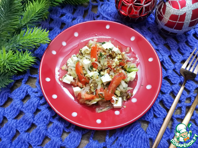 Салат из дайкона, с помидором, огурцом, фетой и грецким орехом.