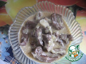 Режем тоненькими длинными полосочками. Складываем в кастрюльку с разогретым раст. маслом и немного обжариваем. Доливаем водичку, чтобы покрыла мясо и тушим почти до готовности.