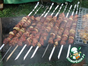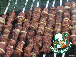 Посыпать мясо специями в отдельной миске (НЕ СОЛИТЬ). В кастрюльку (в которой будет мариноваться мясо - у меня на 5 л) укладывать слоями мясо - лук. Не надо сильно утрамбовывать. В кружке смешать квас и соевый соус. Залить сверху мяса. В 3-4 местах пальчиком сделать проколы, чтобы соус равномерно пропитывал мясо. Оставить на 3 часа. Пока будут готовы угли в мангале пройдет еще немного времени. У нас в общем мяско мариновалось часа 4. Нанизывать на шампурики и жарить. -
