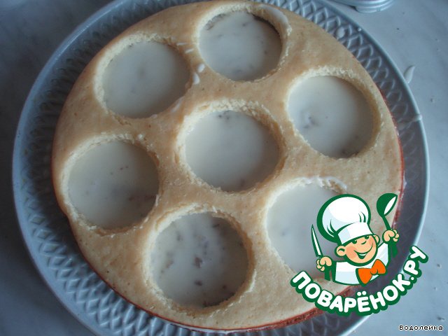 • Дальше, берем корж, который мы не разрезали, делаем в нем вот такие дырочки чашкой и кладем на наш тортик.
