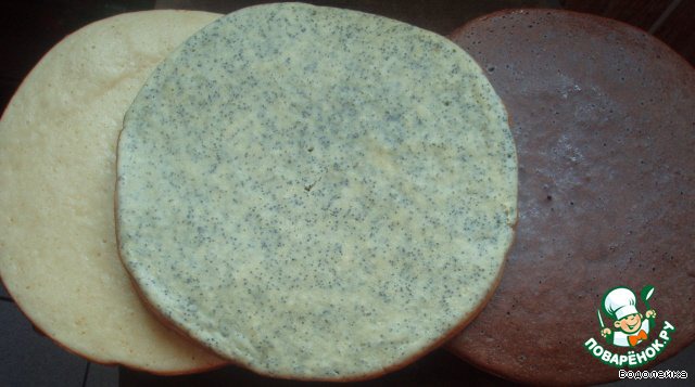 • Вот наши 3 коржа. Когда они остынут, берем корж с маком и какао разрезаем пополам. В итоге у нас получается 5 коржей.