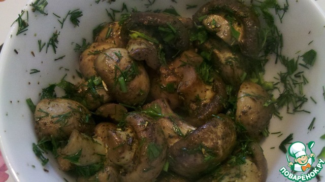 Крепенькие шампиньоны чистим, срезаем ножку под самую шляпку, промываем водой и обсушиваем на полотенце.