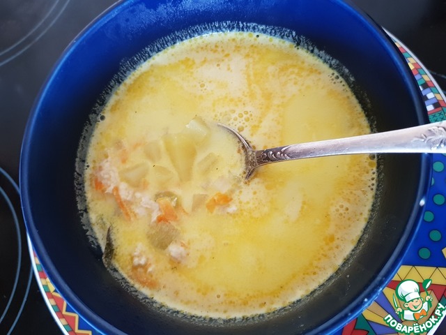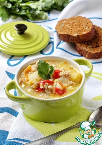 Пока варится фарш, в другую кастрюльку, в кипящую воду кидаю нарезанный картофель, пассированный лук с морковкой, сладкий перец, когда картофель готов, переливаю фарш с бульоном к овощам, добавляю специи по вкусу и начинаю понемногу добавлять плавленый сырок, постоянно пробуя. Когда понравится вкус, значит концентрация сырка достигла нужной степени.