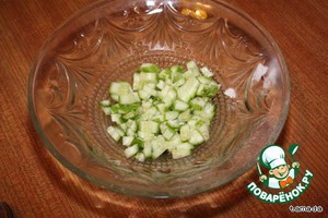 • Итак, приступим. Нарежем огурец мелкими кубиками. Отправляем в салатник.