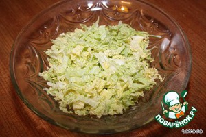 • Немного пекинской капусты нарезаем произвольно. Туда же, к огурцу для компании.