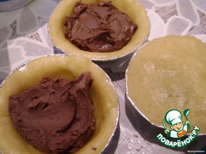 Смешать все ингредиенты и из полученного теста выложить в смазанные формочки дно и бока.Затем в каждую положить джем или как у меня конфитюр и шоколадную пасту.Наверх из теста выложить кружок и каждый наколоть вилкой или зубочисткой.