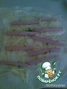 2. Выложить сыр сулугуни (натертый на терке), колбасу (нарезать тонкими полосочками), помидор (нарезанный полукольцами)и мелко нарезанный укроп.