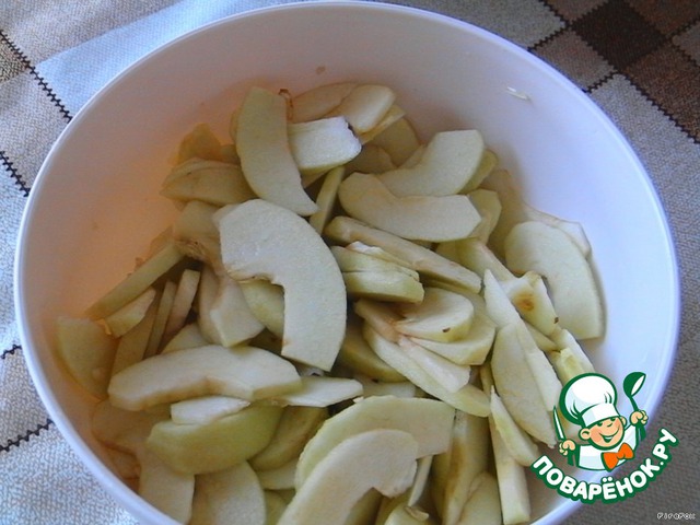 Резать пластинками их не обязательно, просто так их потому удобнее выкладывать в форму. Почищенные яблока сбрызнем лимонным соком не только для того что б они не чернели, но и что б придать им кислинку ( у меня яблока были довольно сладкие) -
