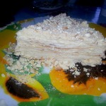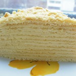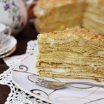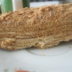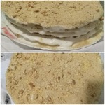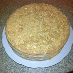 взбить яйца с сахаром, добавить мeд, сл. масло растаявшее, соду гашенную. Поставить всe на водяную баню на 7 минут., постоянно помешивая. Сняв с паровой бани-дайте немного смеси остыть и добавляя муку, вымешивайте тесто. Получившуюся массу разделите на 12 равных частей и раскатывайте каждую лепeшку толщиной, как на лапшу. (Тесто очень быстро сохнет и труднее раскатывается-держите его под полотенцем и быстрее работайте).