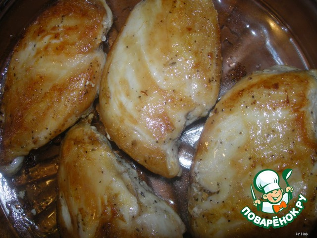 • 5. Куриные грудки смажьте 1 ст. ложкой растительного масла, посолите, поперчите и обжарьте с обеих сторон до румяной корочки на сковороде.