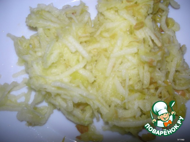 • 1. Для приготовления соуса очищенное яблоко натрите на терке, подлейте к нему 2 ст. ложки воды и тушите на маленьком огне около 10 минут до мягкости.